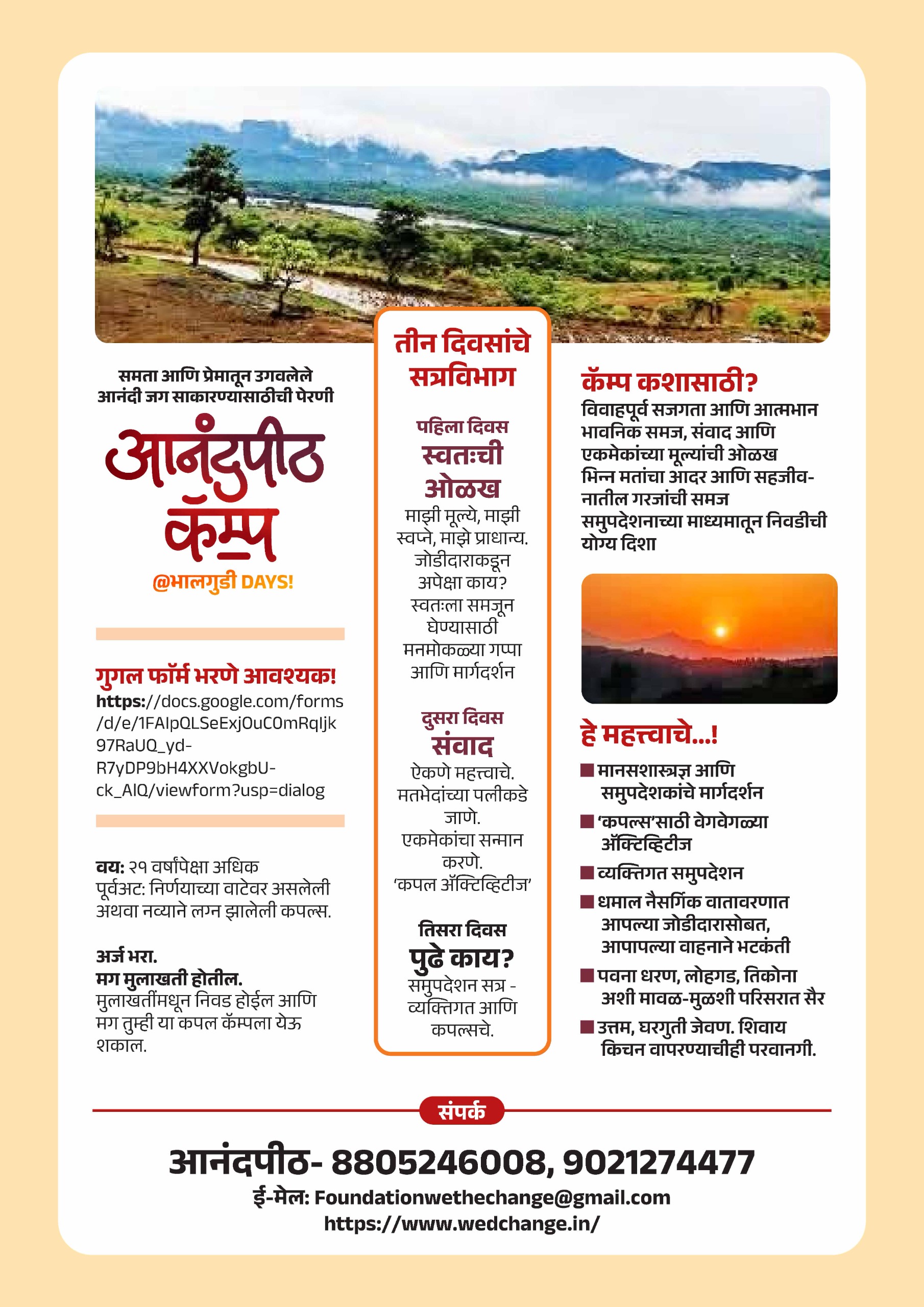 "समता आणि प्रेमातून उगवलेले आनंदी जग साकारण्यासाठीची पेरणी", हे संस्थेचे एका ओळीतील 'व्हिजन डॉक्युमेंट' आहे. भारताची कल्पना नव्या पिढीपर्यंत पोहोचवणे; ती पेरणे, रुजवणे आणि संविधानिक मूल्यांवर नव्या भारताला घडवणे संस्थेला अपेक्षित आहे. म्हणूनच पुणे जिल्ह्यातील मुळशी तालुक्यात कोळवण खोऱ्यातील भालगुडी गावात आनंदपीठ @भालगुडी DAYS! असे या परिसराचे आणि प्रकल्पाचे आम्ही नामकरण केले आहे.