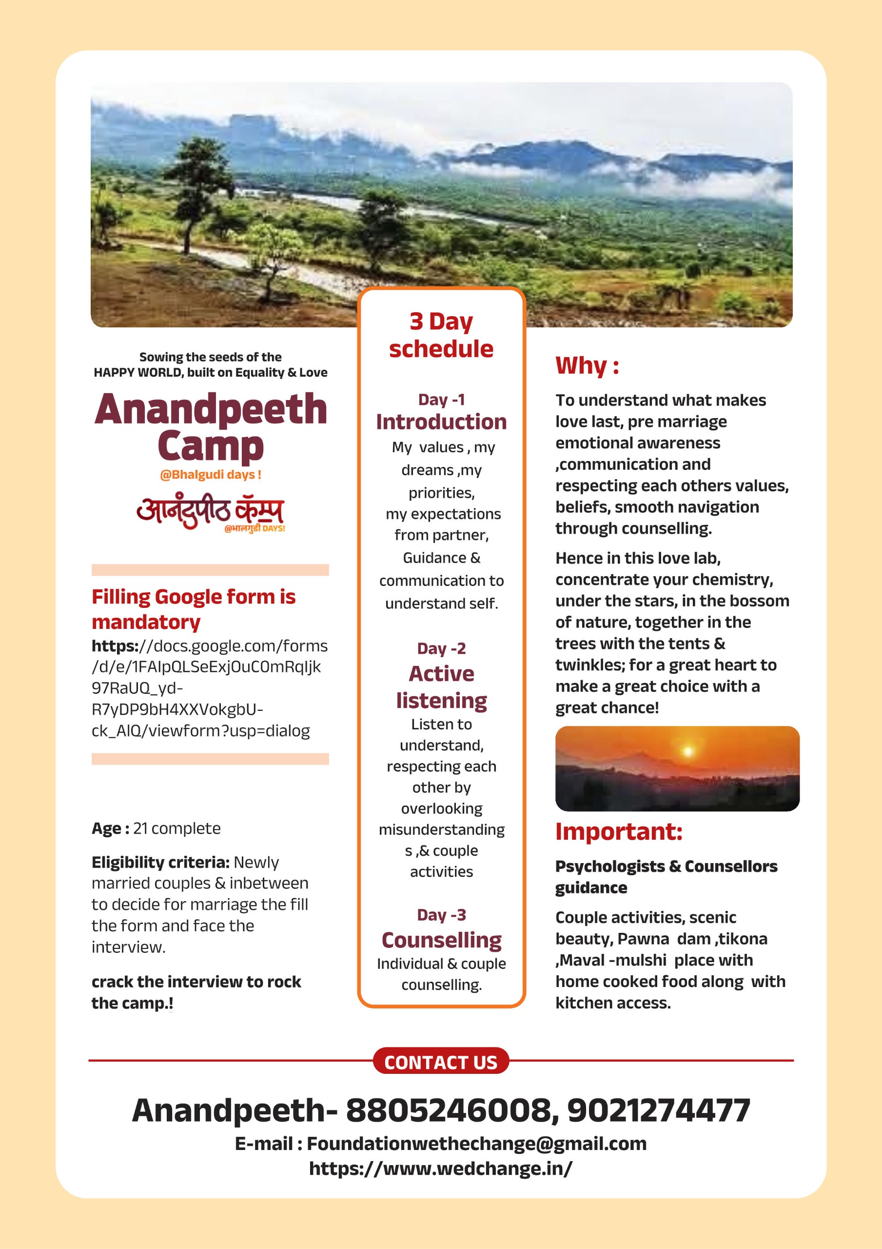"समता आणि प्रेमातून उगवलेले आनंदी जग साकारण्यासाठीची पेरणी", हे संस्थेचे एका ओळीतील 'व्हिजन डॉक्युमेंट' आहे. भारताची कल्पना नव्या पिढीपर्यंत पोहोचवणे; ती पेरणे, रुजवणे आणि संविधानिक मूल्यांवर नव्या भारताला घडवणे संस्थेला अपेक्षित आहे. म्हणूनच पुणे जिल्ह्यातील मुळशी तालुक्यात कोळवण खोऱ्यातील भालगुडी गावात आनंदपीठ @भालगुडी DAYS! असे या परिसराचे आणि प्रकल्पाचे आम्ही नामकरण केले आहे.